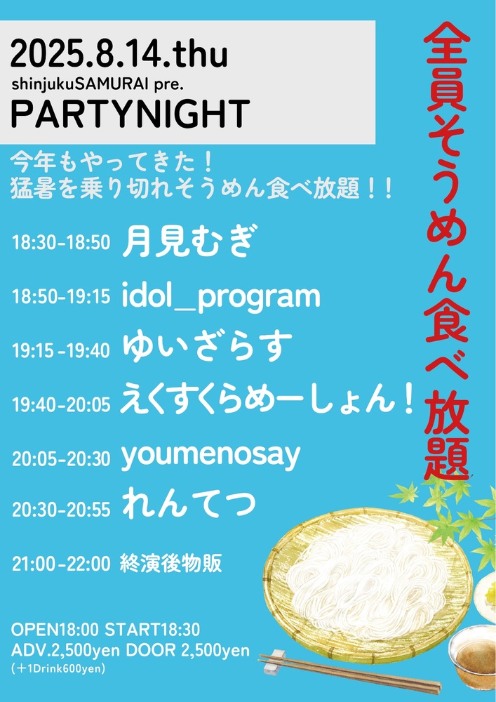 8月14日(木)、「shinjukuSAMURAI pre.「PARTY NIGHT〜今年もやってきた!猛暑を乗り切れそうめん食べ放題!〜」」出演決定!